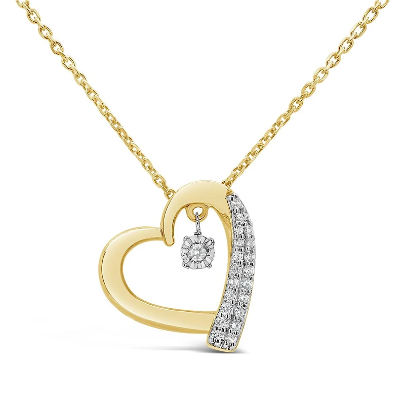 The heart-shaped design symbolizes love, making this pendant a perfect gift for a loved one or a meaningful addition to your own jewellery collection. The 10K yellow gold adds warmth and elegance to the pendant, complementing the diamonds beautifully. Its exquisite design and captivating movement make it a versatile piece that can be worn for both formal occasions and everyday wear.