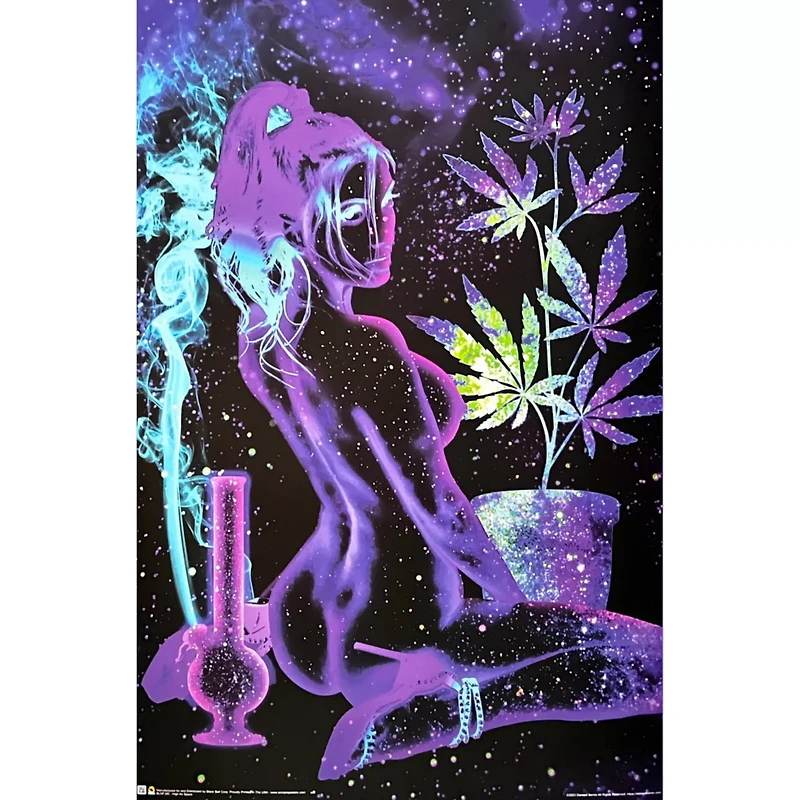 Bring your walls into another dimension. This neon High Space Blacklight Poster sitting at 36" by 24" by Daveed Benito features an interstellar muse surrounded by vibrant cosmic swirls and botanical details. Glows bright under LED blacklight for a head-turning statement in any chill zone! Officially licensed