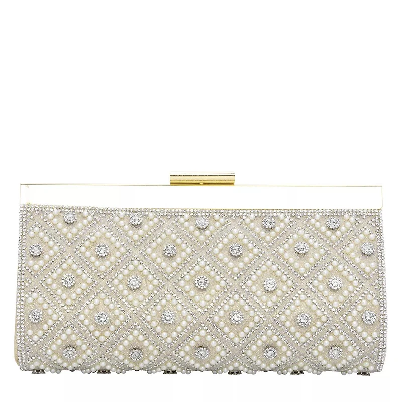 Add elegance to your evening attire with the Diamond Pattern Detail Clutch in gold from Kell & Katie. Faux pearls, rhinestones, and beads intricately decorate the shimmer fabric construction for bold appeal.