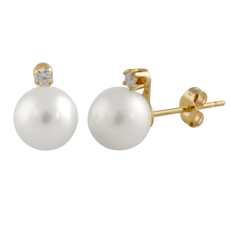14k gold earrings with 7-7½mm white round freshwater pearl and 0.06ct DTW.