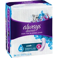 - Always Discreet Moderate Long Incontinence Pads offer up to 100% leak-free protection. Unique boosted protection zone in the center for protection where you need it most. Comfortable and discreet fit that is barely noticeable under clothes. OdorLock technology neutralizes odors instantly and continuously. LeakGuards help keep wetness away from sides. Find your right size with the Always Discreet My Fit chart.