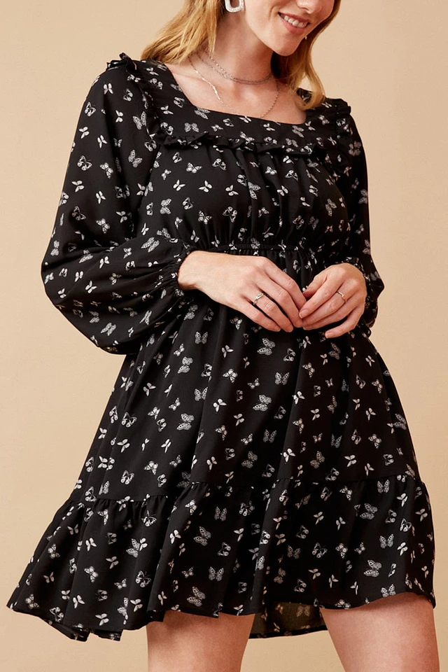 Small Floral Flounce Sleeve Square-Neck Dress with Smocked Top and Open Back
