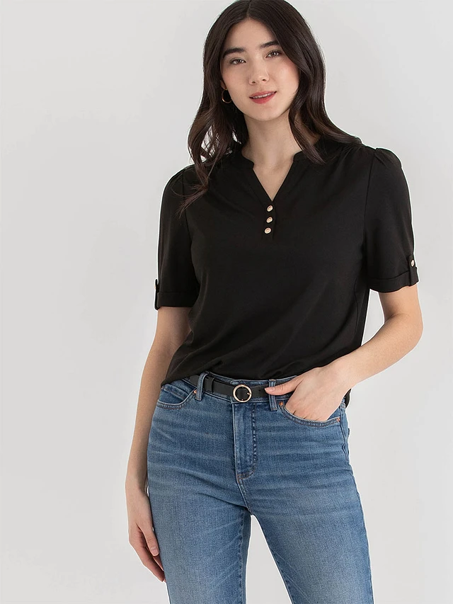 Ribbed Curved Henley Elbow Sleeve Top