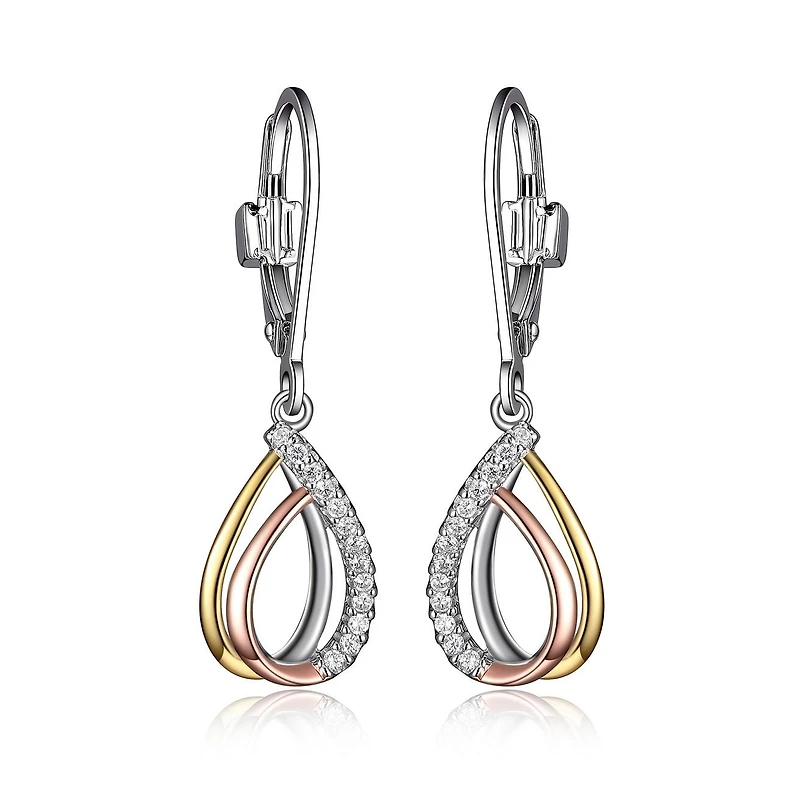 SS ELLE "Ocean" Gold Plated Sterling Silver 3-Tone Cubic Zirconia Tear Drop Leverback Earring