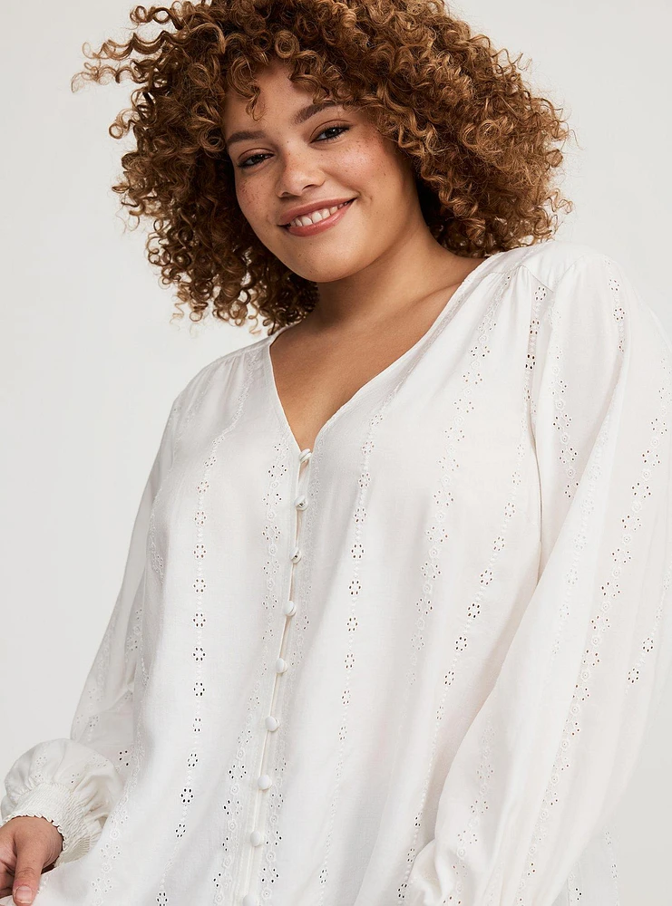 FIT Measures 30"" from shoulder (size 2). MATERIALS + CARE Challis woven fabric: Your favorite easy-but-polished fabric. Stretch level: None. 100% rayon. Machine wash cold. Line dry. Imported. DETAILS V-shaped neckline. Blouson sleeves. Button front.