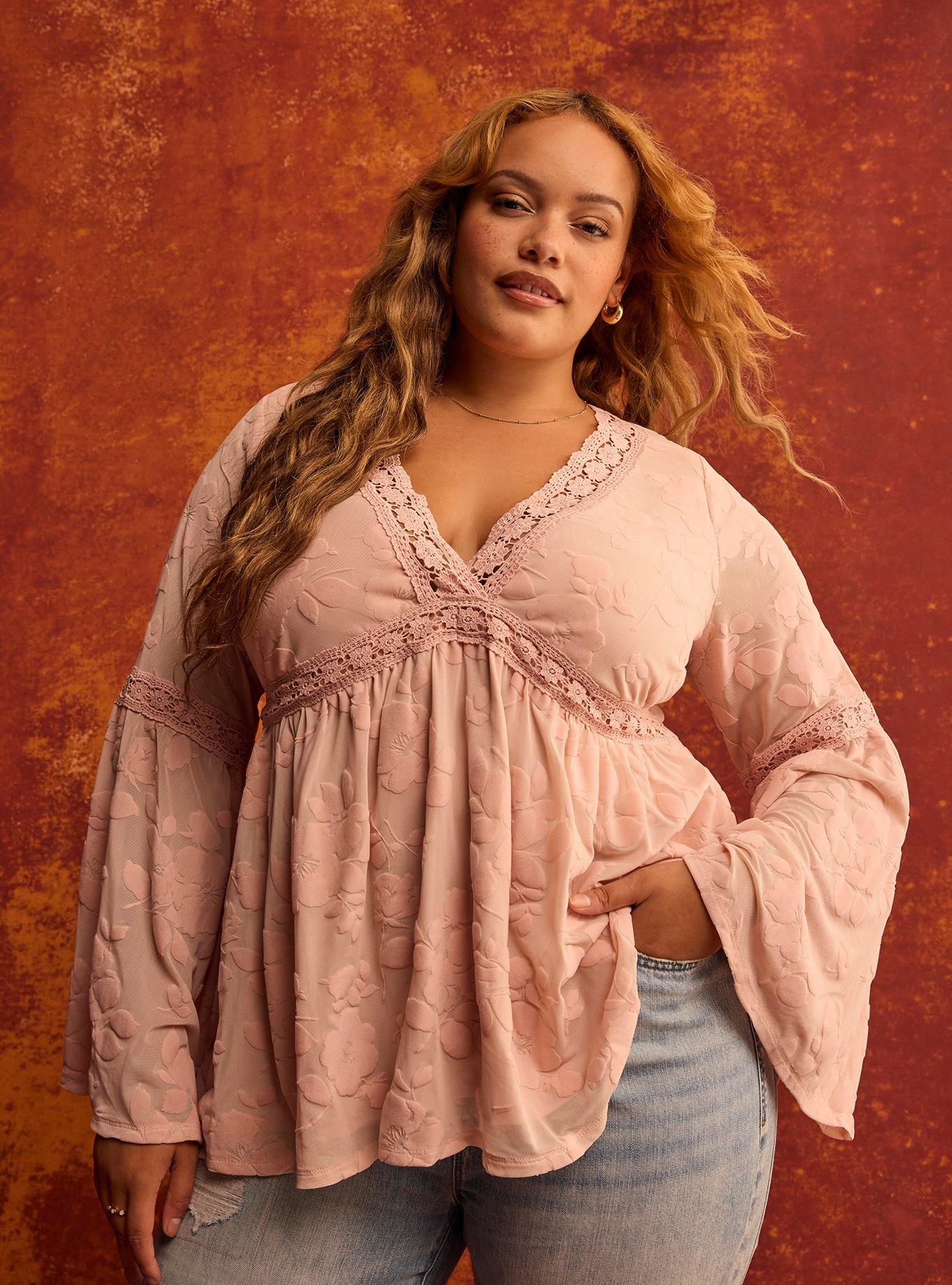 FIT Measures 32'' from shoulder (size 2). MATERIALS + CARE Soft mesh knit fabric. 95% polyester, 5% spandex. Machine wash cold. Tumble dry low. Imported. DETAILS V-shaped neckline. Long bell sleeves with insets at tier. Shirring and lace insets at waist. FESTI Beautiful, evocative pieces for free spirits and the wild at heart. All dreamed up to tell your story. Your next adventure starts here.