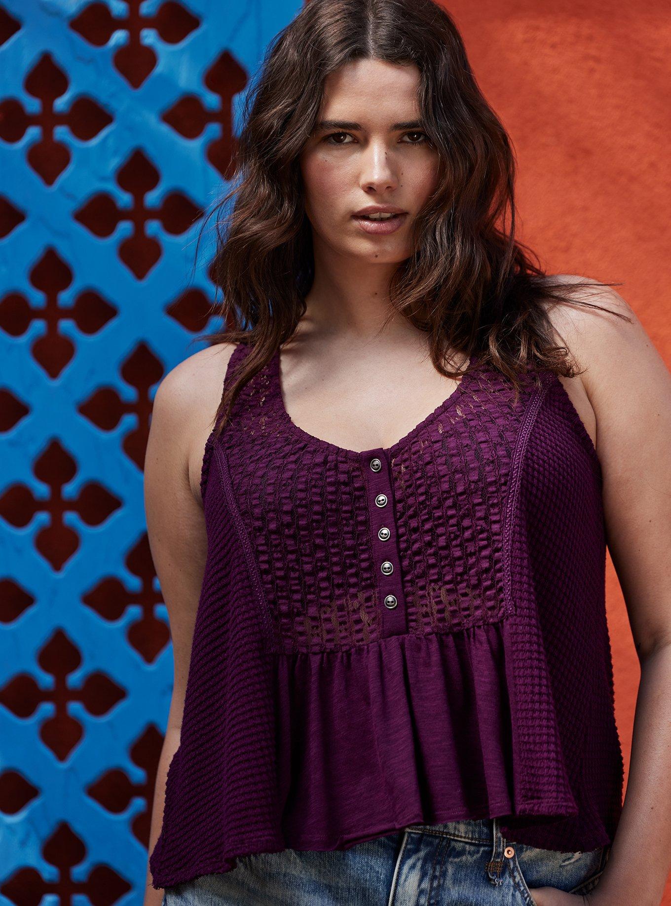 FIT Relaxed fit. Measures 25'' from shoulder (size 2). MATERIALS + CARE Slub jersey waffle knit fabric. 50% cotton, 45% nylon, 5% spandex. Machine wash cold. Line dry. Imported. DETAILS Scoop neck. Sleeveless. Button front. Lace trim. Lived-in distressing at hem. Bow tie detail on back. FESTI Beautiful, evocative pieces for free spirits and the wild at heart. All dreamed up to tell your story. Your next adventure starts here.