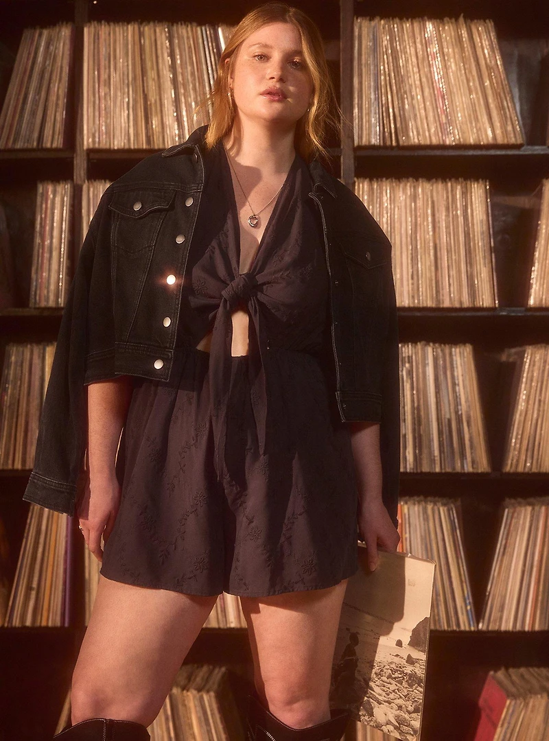 FIT Measures 3'' inseam (size 2). MATERIALS + CARE Challis woven fabric: Your favorite easy-but-polished fabric. Stretch level: None. 72% viscose, 28% lyocell. Machine wash cold. Tumble dry low. Imported. DETAILS Short flutter sleeves. V-shaped neckline. Eyelet texture. Tie front detail. Back button closure with keyhole cutout. FESTI Beautiful, evocative pieces for free spirits and the wild at heart. All dreamed up to tell your story. Your next adventure starts here.