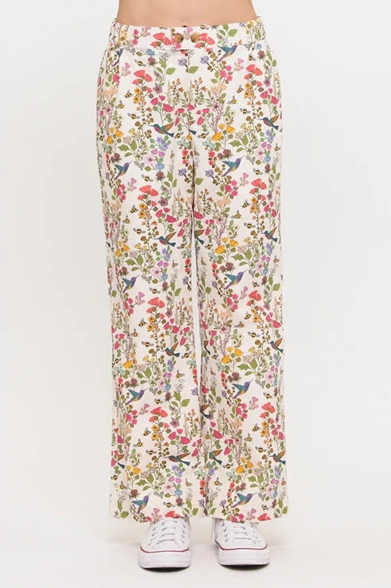 Floral Hummingbird Print Wide Leg PantsWhitePartial Elastic WaistFront Two Button Closure100% Cotton