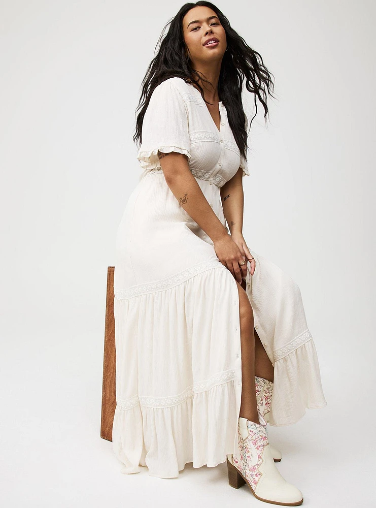 FIT Measures 56"" from shoulder (size 2). MATERIALS + CARE Washable Gauze woven fabric: The lightweight, breathably soft fabric you love is, at last, wash, wear and go! Stretch level: None. 74% rayon, 26% polyester. Machine wash cold. Tumble dry low. Imported. DETAILS Y-shaped neckline. Short flutter sleeves. Faux front buttons from waist down. Crochet lace details.