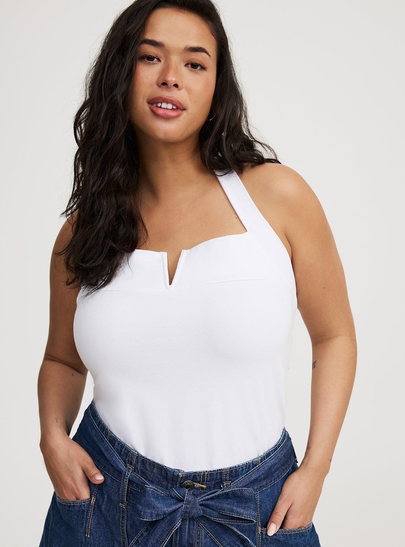 FIT Measures 28"" from shoulder (size 2). MATERIALS + CARE Foxy knit fabric: Holds you in, smooths you out and doesn't ride up. Stretch level: Maximum. 95% cotton, 5% spandex. Machine wash cold. Tumble dry low. Imported. DETAILS Square neck with halter. Notched v detail.
