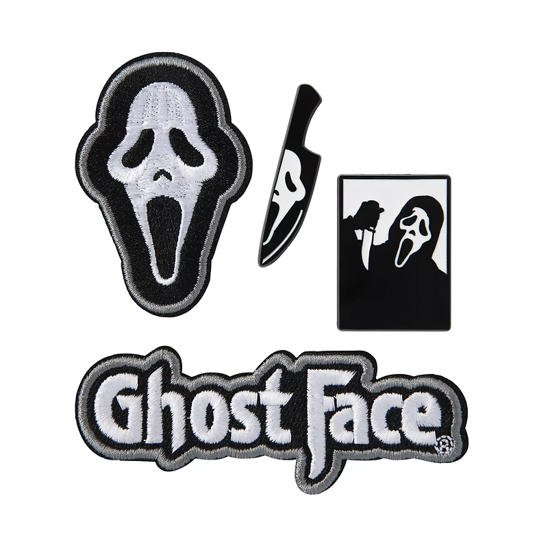 Show your love for the iconic Ghost Face with this iron-on patch and lapel pin set. Featuring a Ghost Face® mask patch, a Ghost Face logo patch, a knife pin, and a Ghost Face pin, this set will look scary-good on your bag, your jacket, and beyond.