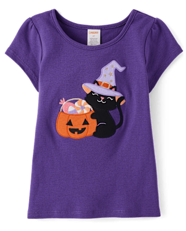 Girls Embroidered Cat Pumpkin Top - Halloween