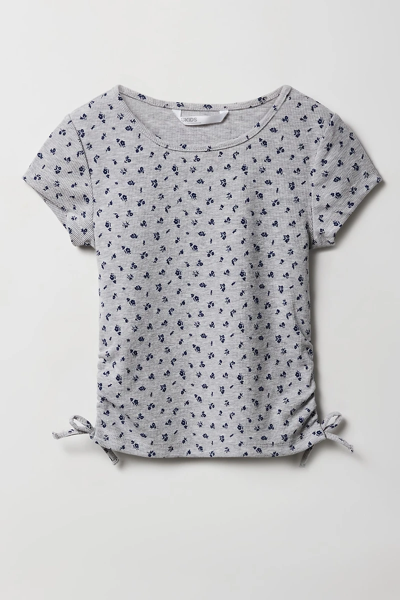 This top features all-over ribbing, crew neckline, cinched drawstring sides, and short sleeves.