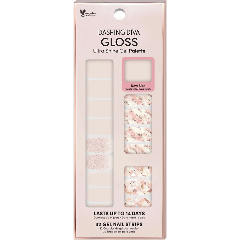 Le kit Gloss- Crystal Clear de Dashing Diva offre une manucure gel durable et ultra-brillante qui tient jusqu'à 14 jours. Ce paquet de 32 bandes pour les ongles est facile à appliquer, résiste aux éclats et ne nécessite aucune lampe UV, garantissant un fini lisse et sans plis. Le design présente une base rose tendre rehaussée d'élégants accents de marbre, de paillettes or rose et de mosaïques. L'application est simple et le retrait est doux, n'endommageant pas l'ongle naturel. Les bandes non utilisées peuvent être conservées pour une utilisation future.