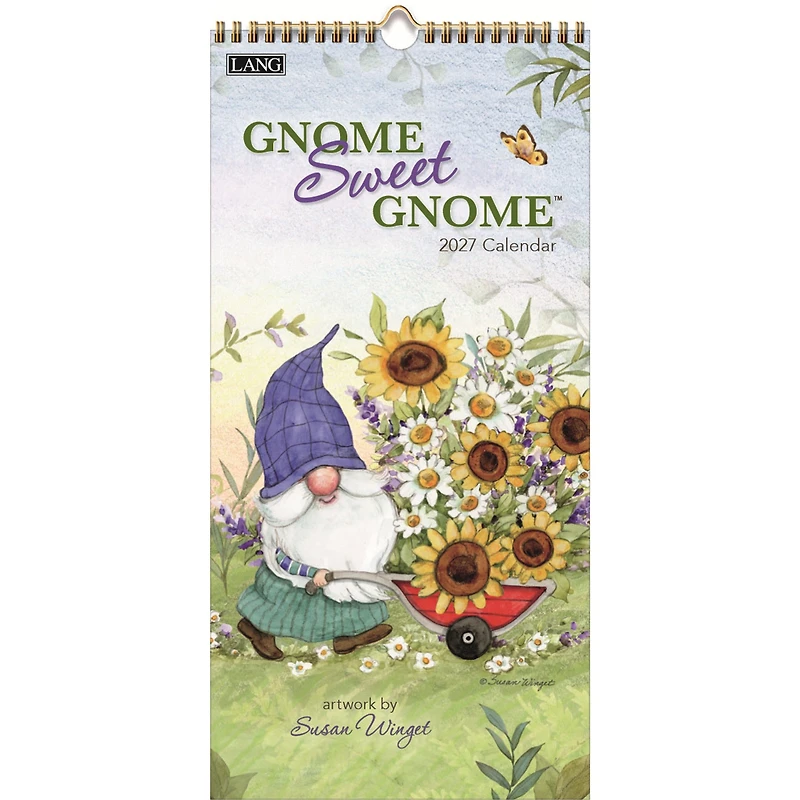 The Gnome Sweet Gnome 2027 Vertical Wall Calendar features monthly artwork of adorable gnomes by Susan Winget in a space-efficient vertical format. LANG Vertical Wall Calendars feature linen embossed paper stock, a spiral binding with hook for hanging, and matching gift jacket. Product Information: Dimensions (closed): 8"H x 8"WDimensions (open): 8"H x 8"WCalendar Format: Wire O Hanger with Small Rectangle GridsCalendar Start Date: January 2027 Sunday Week StartTime Span: 12 month full page gridPaper Source: Non-FSCInk Type: Soy-BasedPackaging: Plastic Free - Envelope/SleeveCreative Artist: Susan Winget Additional Features: Contains Canadian Stat HolidayContains Lunar CycleContains Mini Reference Month