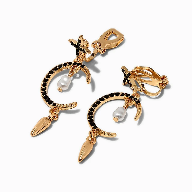 Gold-tone Cross Moon Dagger Clip-On Drop Earrings