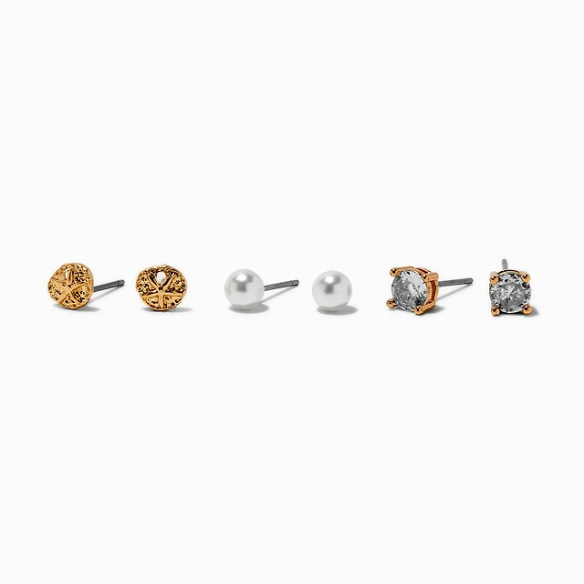 Gold-tone Cubic Zirconia Sand Dollar Stud Earrings - 3 Pack