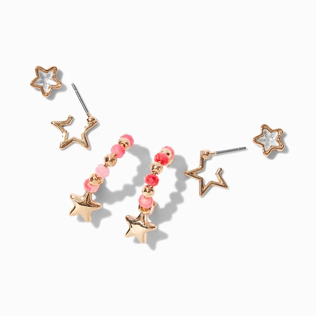 Gold-tone Pink Beaded Star Earring Stackables Set - 3 Pack