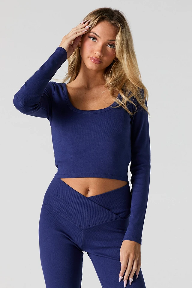 Haut côtelé à manche longue ourlet courbé et encolure ronde
