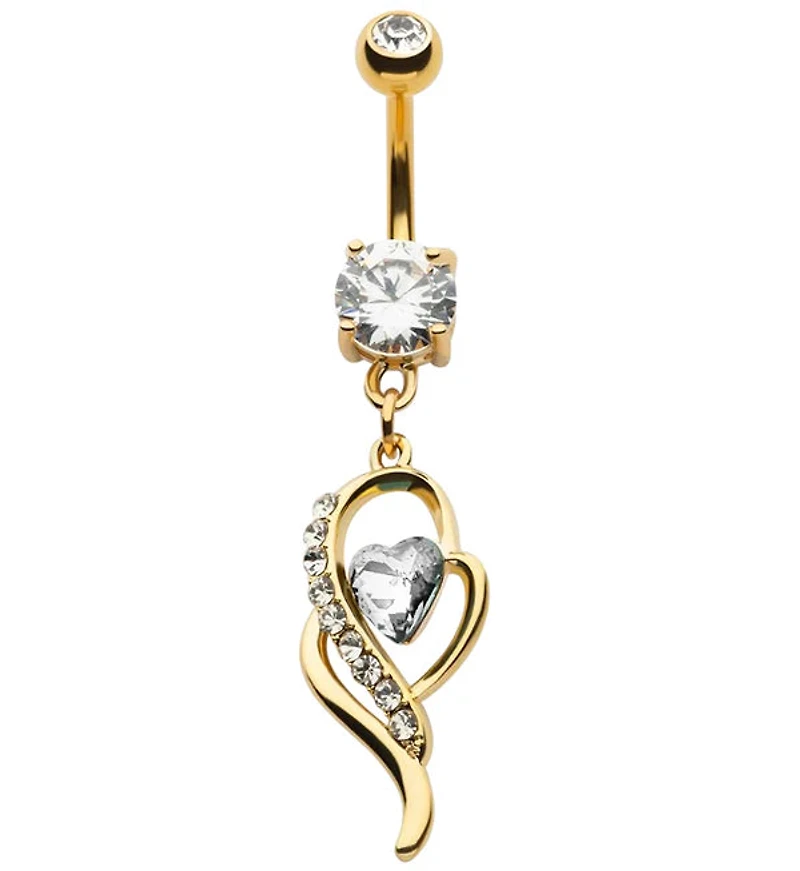 Externally Threaded Gold PVD Steel CZ Heart with Multi Clear CZ Dangle Navel. Made from Surgical Steel.