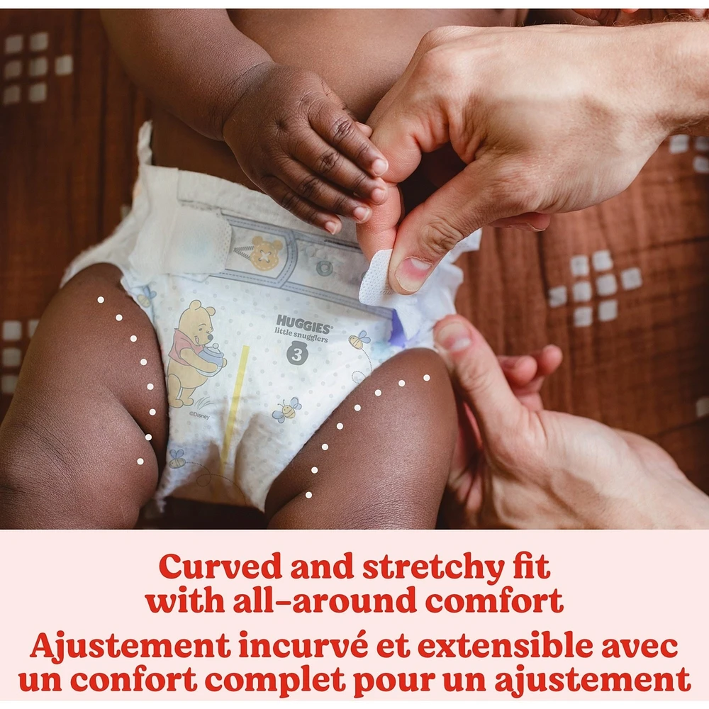 No. 1 Choice of Canadian Hospitals.* Huggies Little Snugglers diapers are developed in partnership with nurses, formulated for sensitive skin, with premium softness and breathability to help keep baby dry & comfortable.(*based on hospital sales data) Absorbent Baby Diapers with Leakage Protection. Huggies' GentleAbsorb Liner provides an extra soft layer of protection that draws moisture away from baby's delicate skin, while the soft Back-pocketed Waistband contains messes and helps prevent diaper blowouts. Additionally, Huggies absorbent Leak Lock System helps eliminate leaks for up to 12 hours of protection, and its wetness indicator changes colour when it's time for a change. Gentle Tummy Fit, Huggies Little Snugglers diapers offer soft and comfy 360° gentle skin protection for baby's delicate skin - extra soft materials provide belly comfort and protection during tummy or feeding time. Huggies Little Snugglers diapers are Clinically Proven to be Hypoallergenic and Dermatologist Tested, Safe for Sensitive Skin. Our disposable diapers are free of elemental chlorine, fragrances, lotions, parabens and natural rubber latex to prevent the risk of irritation, reactions and diaper rashes. Diaper Designs and Available Sizes, featuring adorable and exclusive Disney Winnie the Pooh designs, Little Snugglers diapers are available in Size Preemie (up to 6 lb.), Size Newborn (up to 10 lb.), Size 1 (8-14 lb.), Size 2 (12-18 lb.), Size 3 (16-28 lb.), Size 4 (22-37 lb.), Size 5 (27+ lb.) and Size 6 (35+ lb.) Buy Huggies diapers and wipes in bulk for your baby or as a gift set for new parents with Subscribe & Save for the best value and saving benefits. Packaging may vary from image shown.