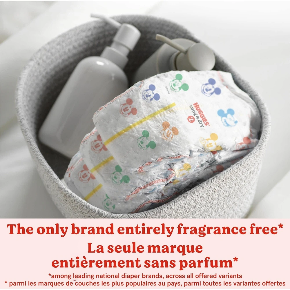Parenting might be hard, but thanks to Huggies Snug & Dry Baby Diapers, diapering doesn’t have to be. As the only leading brand that is entirely fragrance free,** Snug & Dry newborn diapers are made to be free of fragrances, added lotions, parabens and natural rubber latex. When it comes to keeping your baby dry, Snug & Dry diapers are there for you even in messy situations. Our Snug & Dry infant diapers are up to 100% leak proof, even from blowouts, and offer up to 20% more leak protection.* Made with the original Leak Lock blowout blocker, Snug & Dry baby diapers help protect against blowouts and ensuing messes. Additionally, these diapers are designed with a curved and stretchy fit for outstanding leakage protection. Made to help your baby live their best life, our infant diapers feature 2X comfort design to provide outstanding softness and gentle protection. An added wetness indicator changes colours when the diaper is wet, allowing you to know right when the diaper needs to be changed. Featuring exclusive Disney designs, Huggies Snug & Dry Diapers are available in size Newborn (6-9 lb.), size 1 (8-14 lb.), size 2 (12-18 lb.), size 3 (16-28 lb.), size 4 (22-37 lb.), size 5 (27+ lb.), size 6 (35+ lb.), size 7 (41+ lb.) and size 8 (46+ lb.). (*urine leaks vs. Pampers Baby Dry, Size 4) (**among leading national diaper brands, across all offered variants) (***among branded open diapers. Excludes preemie size.)