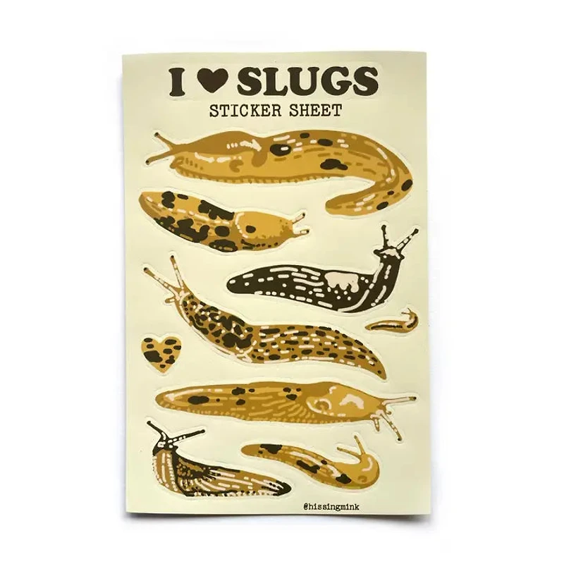 Share your love of everyone's favourite mollusc with this 4x6 sticker sheet! Each sheet has 10 weatherproof stickers featuring familiar species such as the Pacific Banana Slug and the European Black Slug. Designed and printed in British Columbia, Canada.