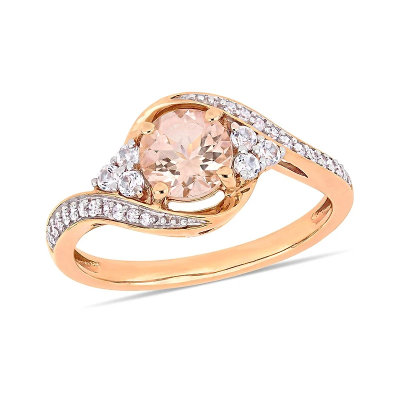 This exquisite morganite and diamond crossover engagement ring is elegantly crafted in 10-karat rose gold and features a stunning morganite as its centerpiece with white topaz stones at each side and 22 glistening diamond adding shimmer to its unique and trendsetting crossover design. Whether worn as an engagement ring or simply a gorgeous gemstone addition, this style is a perfect choice for today's contemporary woman seeking elegance and sophistication in her daily look. Choose this ring either for yourself or someone you love.