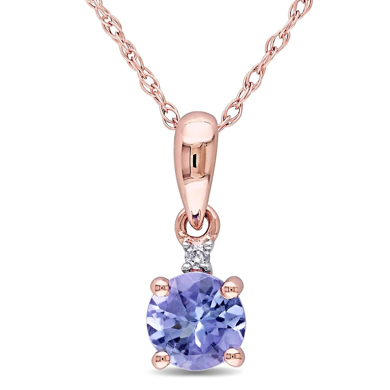 This stylish necklace features a round-cut tanzanite and round white diamonds set in 10-karat rose gold. This pendant is hung on a rope chain and is secured with a spring ring clasp.