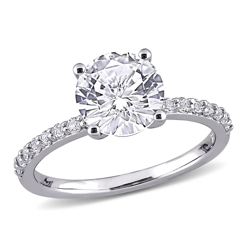 This beautiful engagement ring is crafted in 10-karat white gold and features a round-cut, prong-set created white sapphire at the center embedded by 16 round-cut, prong-set created white sapphires sliding down the band, to add sparkle and elegance to your look. This wedding ring is enhanced with high polish finish. Show that special someone how much you love them with this gorgeous bridal ring and make her feel like princess.