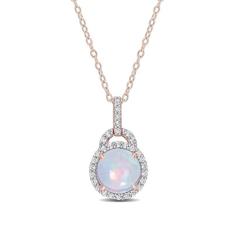 This simplistic halo pendant is a great gift for women with a classy taste. Crafted in lustrous rose plated sterling silver, this intricate pendant features a round cabochon flat bottom, prong-set blue Ethiopian opal at the centre, encased by 31 prong-set created white topaz gemstones in a halo design. Finished with a brilliant polish, the pendant suspends on an 18-inch long round cable chain secured with a spring-ring clasp. A timeless addition to every wardrobe.