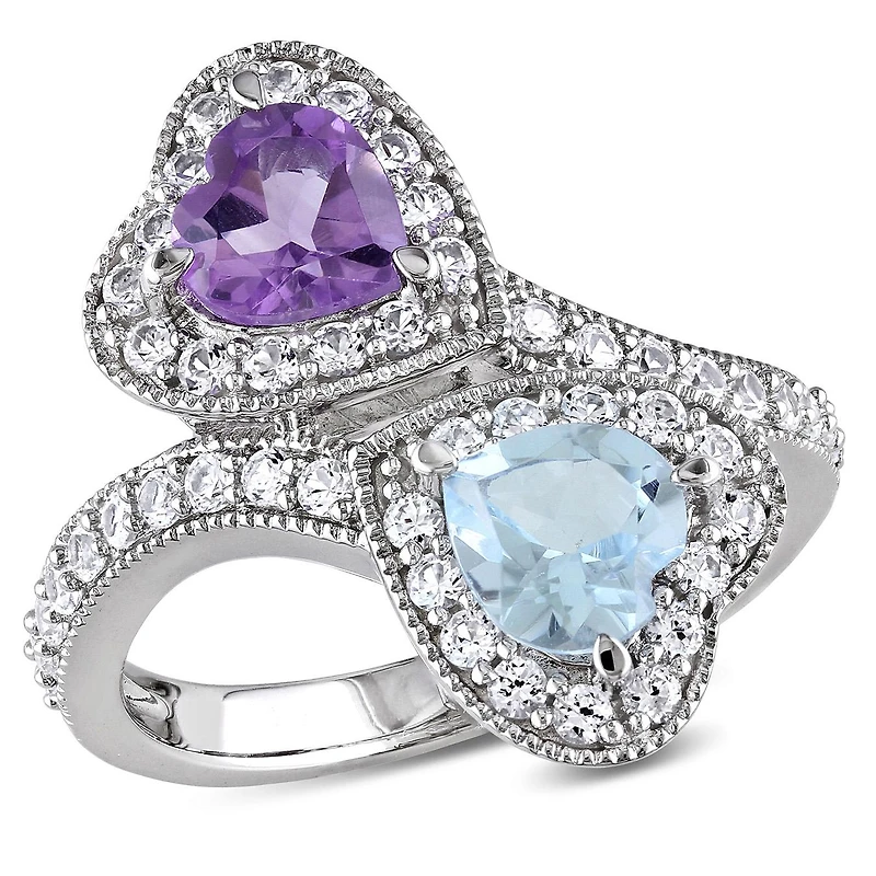 Melt her heart with this Amethyst, Sky Blue topaz and Created White Sapphire Double Heart Bypass Ring. Crafted in lustrous sterling silver and feature two heart-shape, prong-set glittering sky blue topaz and amethyst gemstones (6 x 6mm) studded in a bypass motif. Further, 48 round-cut pave-set created white sapphire gemstone studded in a halo and also augmented on its band. Make her feel like a princess with this heart bypass ring. Enhanced with a milgrain finish, this gorgeous ring is sure to make her heart flutter.