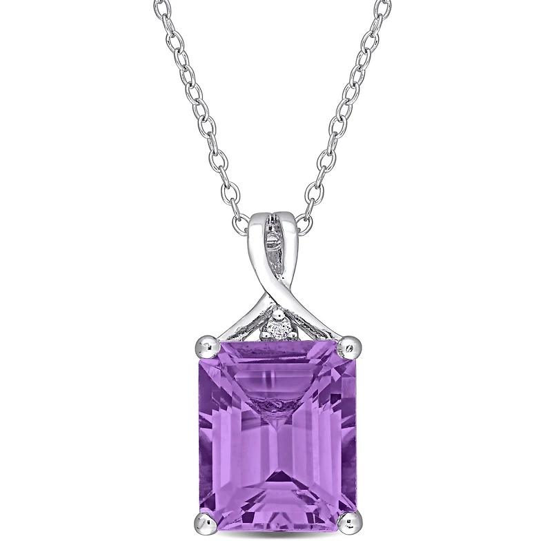 This bright rectangular solitaire necklace is crafted in sterling silver. This beautiful pendant features an octagon-cut, prong-set amethyst centre stone crowned by a round-cut, white topaz gemstone. Enhanced with a high polish finish, this attractive pendant is suspended on an 18-inch cable chain and is secured with a spring ring clasp. This necklace is sure to add a burst of colour and class to any occasion. A versatile addition to your jewellery collection.