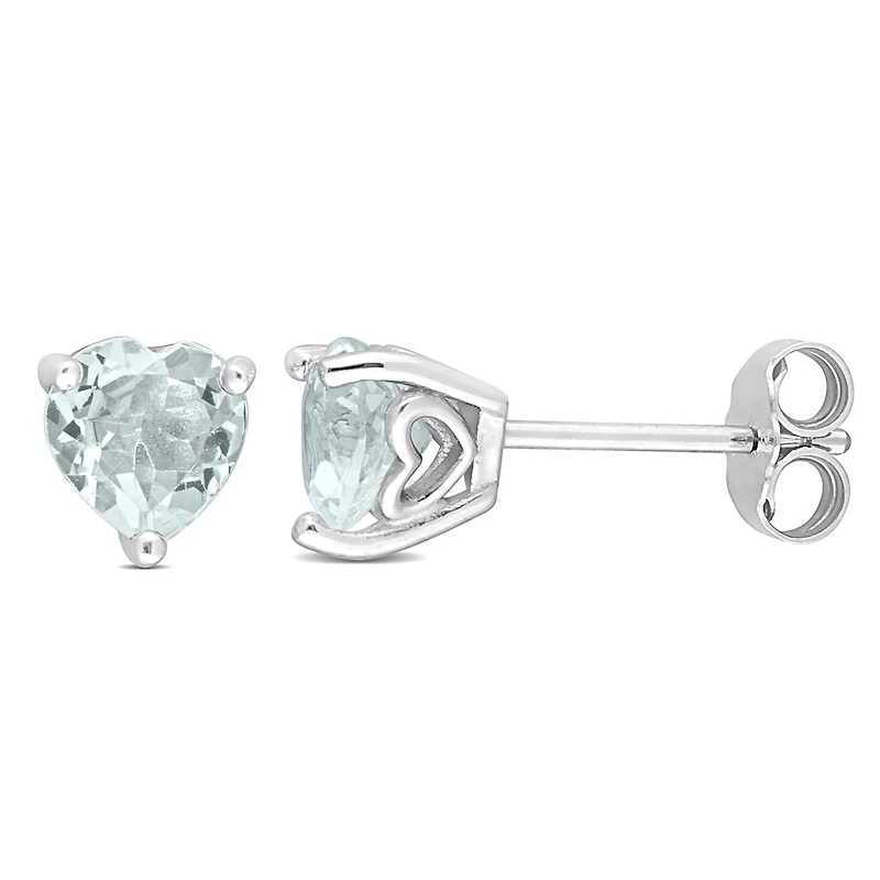 Make a lasting impression with these charming Aquamarine Stud Earrings. Mounted in shimmering sterling silver, they feature two heart-cut, 3 prong-set, aquamarine gemstones (6x6mm) embellished in a heart detail classic basket setting. Enhanced with a high polish finish, these versatile earrings fasten with butterfly closures for longer durability. Create a buzz with these enchanting stud earrings.
