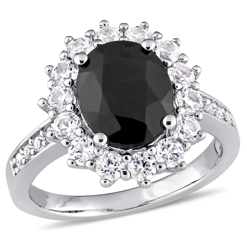 This stunning oval-cut black sapphire and created white sapphire ring is crafted in lustrous sterling silver and features a gorgeous oval halo design with added shimmer along the band. This ring is the perfect elegant gift either for yourself or someone you love.