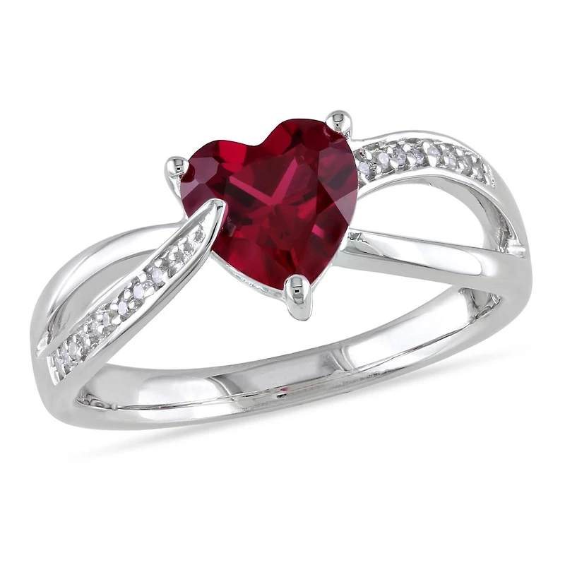 This attractive ring features a heart-cut created ruby center stone with round white diamond side stones set in sterling silver. This ring glimmers with a high polish finished.