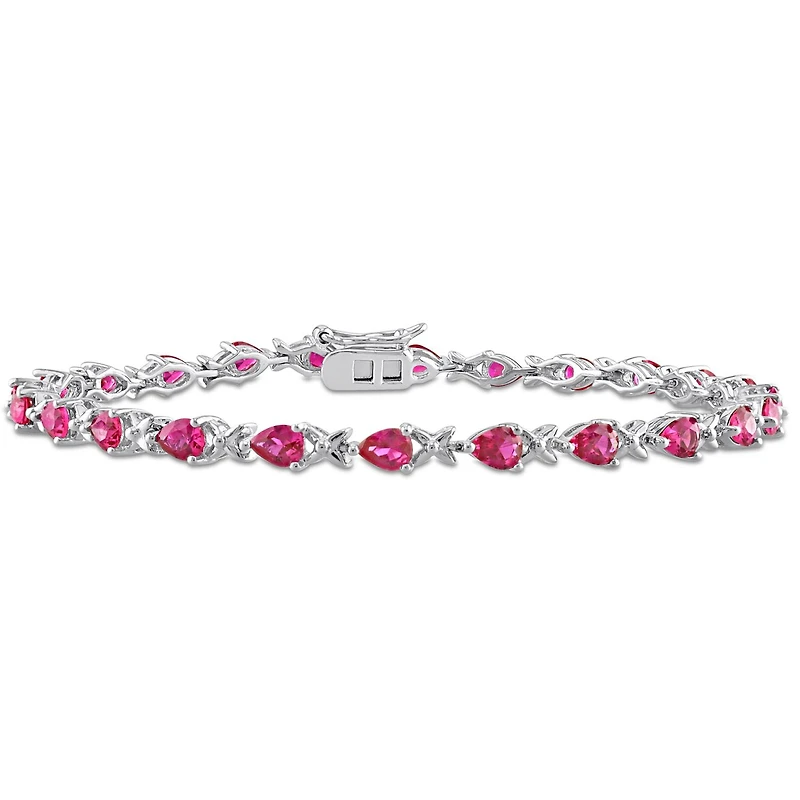 Add a touch of sophistication to your jewellery collection with the 5 1/3ct TGW Pear-cut Created Ruby X Link Bracelet in Sterling Silver. This stunning bracelet features a combination of pear-cut created rubies in a classic X link style, giving it a unique and fashionable look that is perfect for any occasion.Crafted with precision and attention to detail, this bracelet is made of high-quality sterling silver, ensuring that it is both durable and elegant. The X link style creates a modern twist on a classic design, making it perfect for layering and stacking with other bracelets.At a size of 5 1/3ct TGW, the pear-cut created rubies are the perfect size to add a pop of colour and sophistication to any outfit. It is the perfect accessory to wear for special events, weddings, or just to add a touch of elegance to your everyday look.
