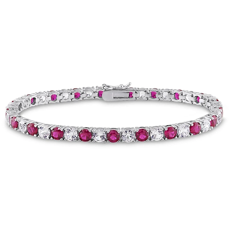 This alluring tennis bracelet features alternating round-cut created ruby and created white sapphires set in sterling silver. This marvelous piece is secured with a box-with-tongue clasp. A perfect choice for that special July birthday in your life.