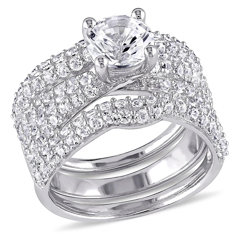 Tie an eternal bond with this opulent 3-pc Semi-Eternity Bridal Set. Crafted in sparkling sterling silver, this extravagant ring features a round-cut, prong-set created white sapphire gemstone (7x7mm) at the center of the middle band with 130 round-cut, pave-set created white sapphire gemstones (1.5x1.5mm) sliding half way down the main band and the two matching wedding bands. Enhanced with a high polished finish, this glamorous ring will always remind her of the best decision she took.