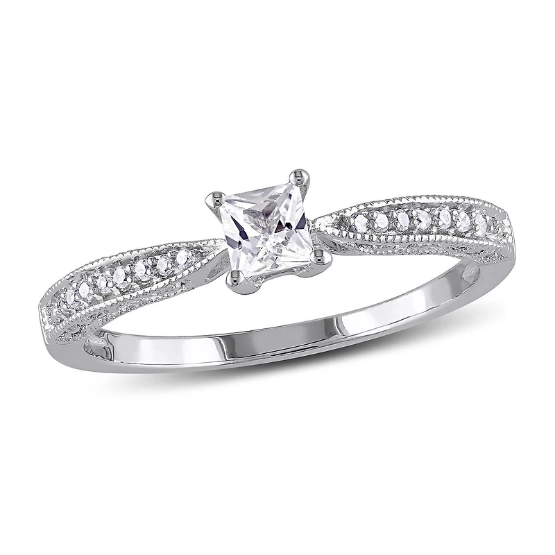 Celebrate your love with this elegant 1/3 CT TGW Created White Sapphire and Diamond Accent Engagement Ring. Crafted in sterling silver, this ring features a stunning created white sapphire center stone, accented by sparkling diamonds along the band. The timeless design and delicate details make it a perfect symbol of your commitment, adding a touch of sophistication and romance to your special moments.