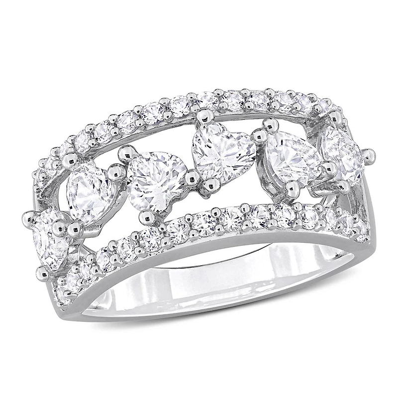 Radiate elegance with the Women's 2 1/4 CT Created White Sapphire Fashion Ring. Created meticulously in Silver, this stunning piece boasts a total gemstone weight of 2 1/4 carats. The ring features a captivating heart-cut created white sapphire at the center, exuding timeless allure. Surrounding the center stone are sparkling round-cut created white sapphires, arranged in a triple-row design that adds a touch of sophistication. This fashion ring, with its delicate and elegant presence, is a perfect choice for both everyday wear and special occasions. An ideal gift for her, whether for an anniversary or any other significant milestone, it perfectly captures the essence of refined beauty. Experience the fusion of classic charm and contemporary style with this exceptional creation from 's collection.