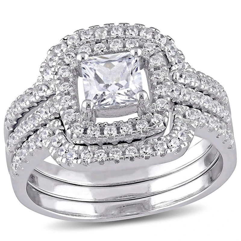 Make a statement with this dazzling 2 1/2 CT TGW Square-shape Cubic Zirconia Halo Bridal Set. Crafted in sterling silver, the set features a stunning square-shaped cubic zirconia center stone, surrounded by a halo of sparkling accents. The intricate design and luxurious shine make this bridal set an elegant choice for celebrating your special day. Perfect for adding a touch of glamour and sophistication to your wedding ensemble.