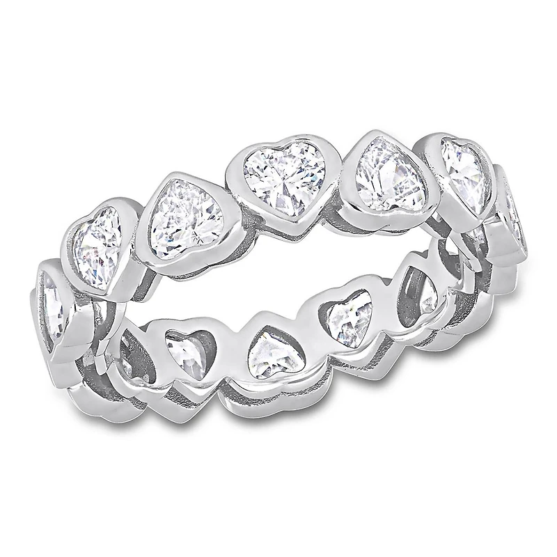 This pretty heart eternity ring is crafted in lustrous sterling silver and features 14 heart-cut, bezel-set, flickering cubic zirconia gemstones studded all along its band. Whether worn as an anniversary band or simply a sumptuous gemstone piece, this ring is sure to make a standout addition to any jewelry collection. Choose this gemstone ring either for yourself or as a special gift for someone you love.