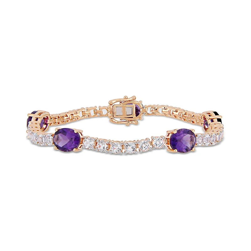 This radiant station tennis bracelet is crafted in rose plated sterling silver and features five oval-cut, prong-set African-amethysts and 30 round-cut, prong-set sparkling white topaz set together in a station design. This exquisite bracelet is sure to add a touch of colour and elegance to any ensemble. Choose this stunning piece either for yourself or someone you love.