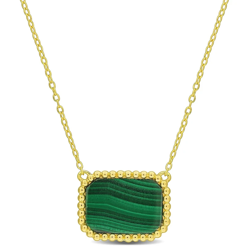 Elevate your style with our stunning 5ct TGW Octagon Shape Malachite Necklace in Yellow Plated Sterling Silver. This exquisite necklace features a mesmerizing malachite gemstone encircled by an intricately designed beaded halo, creating a captivating and elegant piece of jewellery. The 17-inch chain provides a comfortable fit, making it a versatile addition to your collection that can effortlessly enhance your look for any occasion.