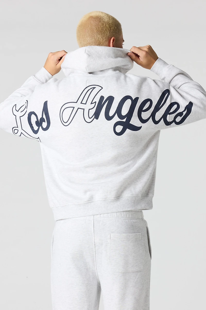 This hoodie features fleece material, embroidered front, graphic back, long sleeves, hood, ribbed knit trim, kangaroo pocket, and boxy fit. Pair with our LA Embroidered Fleece Sweatpant to complete the look.