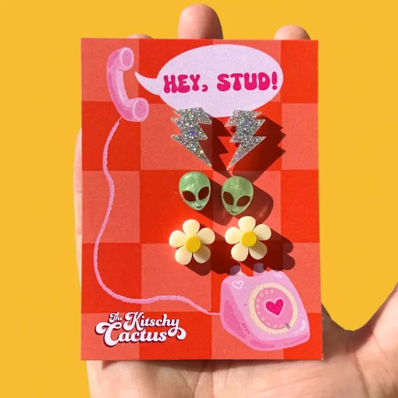 Lightning Alien Flower 3 Piece Stud Earring SetHandmadeBackings Are Nickel Free Stainless SteelMade In Canada