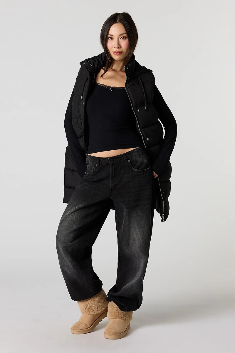 This vest features puffer construction, drawstring hood, zip-up button-up front, zipper pockets and longline length. Model: 5'7" in a size S 100% Polyester Machine Wash In Cold Water - Gentle Cycle With Like Colours - No Bleach - Lay Flat To Dry - Low Iron Imported