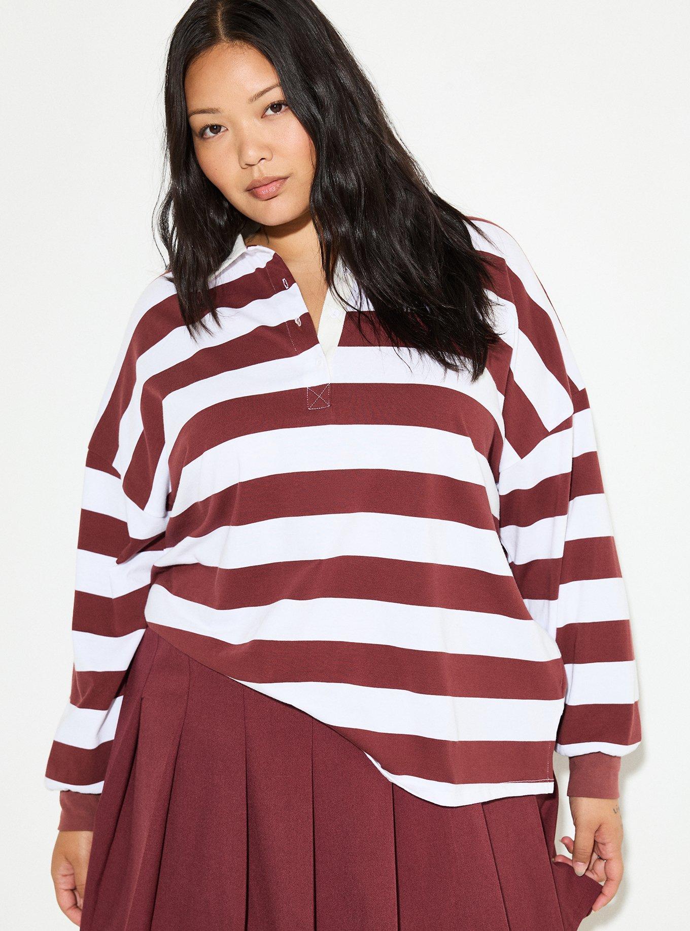 sporty stripes are too cute to sub out! FIT measures 28.25'' from shoulder (size 2). MATERIALS + CARE cotton jersey knit fabric. 100% cotton. machine wash cold. tumble dry low. imported. DETAILS collared neckline. button closures long sleeves. LOVESICK the vibes are high and the ‘fits are iconic. salty hair, always. weekend plans, locked. car windows, down. POV: you’re living your best life in lovesick. AS SEEN ON @DOMNOTATEENMOM